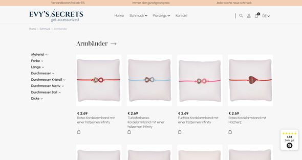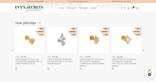 Lassen Sie sich von Evy's Secrets ausstatten! Der Webshop von Evy's Secrets bietet jede Woche ein neues Schmucksortiment an. Neben der großen Auswahl an Armbändern und Ohrringen können Sie sich dort auch viele verschiedene Piercing‘s stechen lassen.